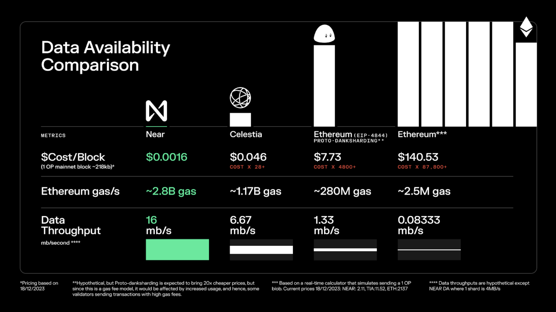 It is more cost competitive for a Layer 2 to use either NEAR or Celestia, compared to the current Ethereum Network and the future EIP-4844, proto-danksharding update.